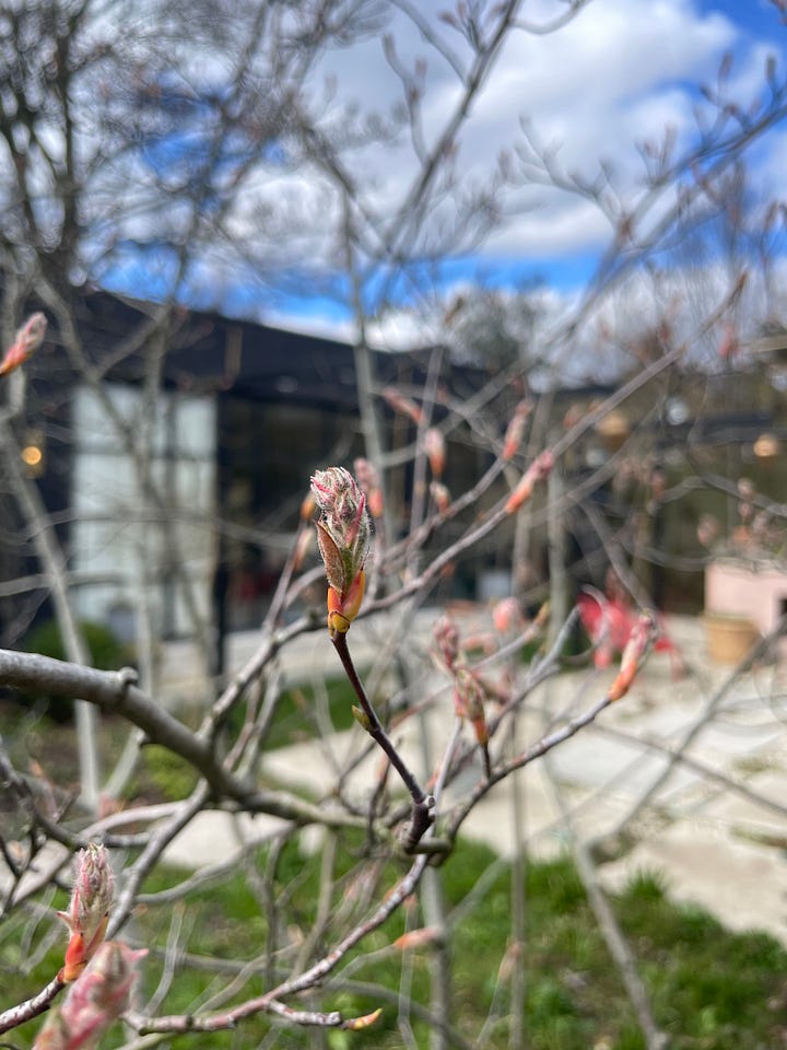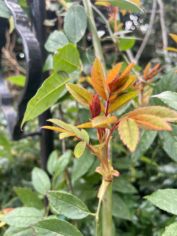 Here, above left, is Cecile Brunner being fabulous, and my poor stressed amelanchiers which have been rudely moved and replanted are budding up in places.