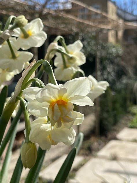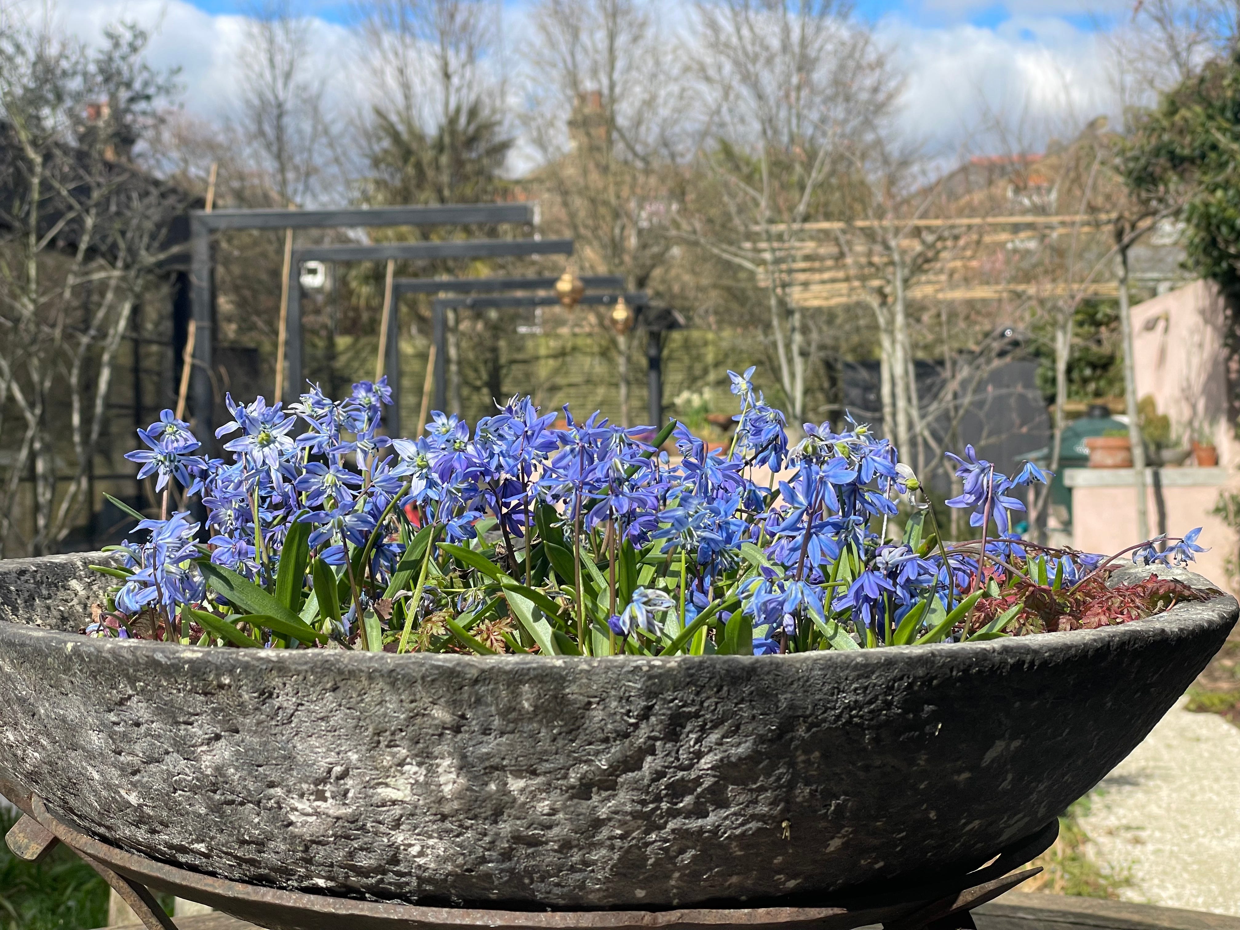 The absolute star of the tiny bulb show is, predictably, the thing I’ve spent the least time on; a bowl of scilla sibirica which I planted the year before last, in November of 2023. This beautiful bowl was a present from Butter Wakefield and the scilla were an absolute joy last year. Over the summer the bowl was used as a perfect sleeping spot by my cat Daphne. She would curl up on it all day long in the sun. I really thought that this year the scilla wouldn’t come back and that I ought to have replanted it, until a couple of weeks ago when they began to appear. In fact, they are better this year than they were last year. Of COURSE they are! God I love them…I LOVE them so much…there is something so perfect about that blue…