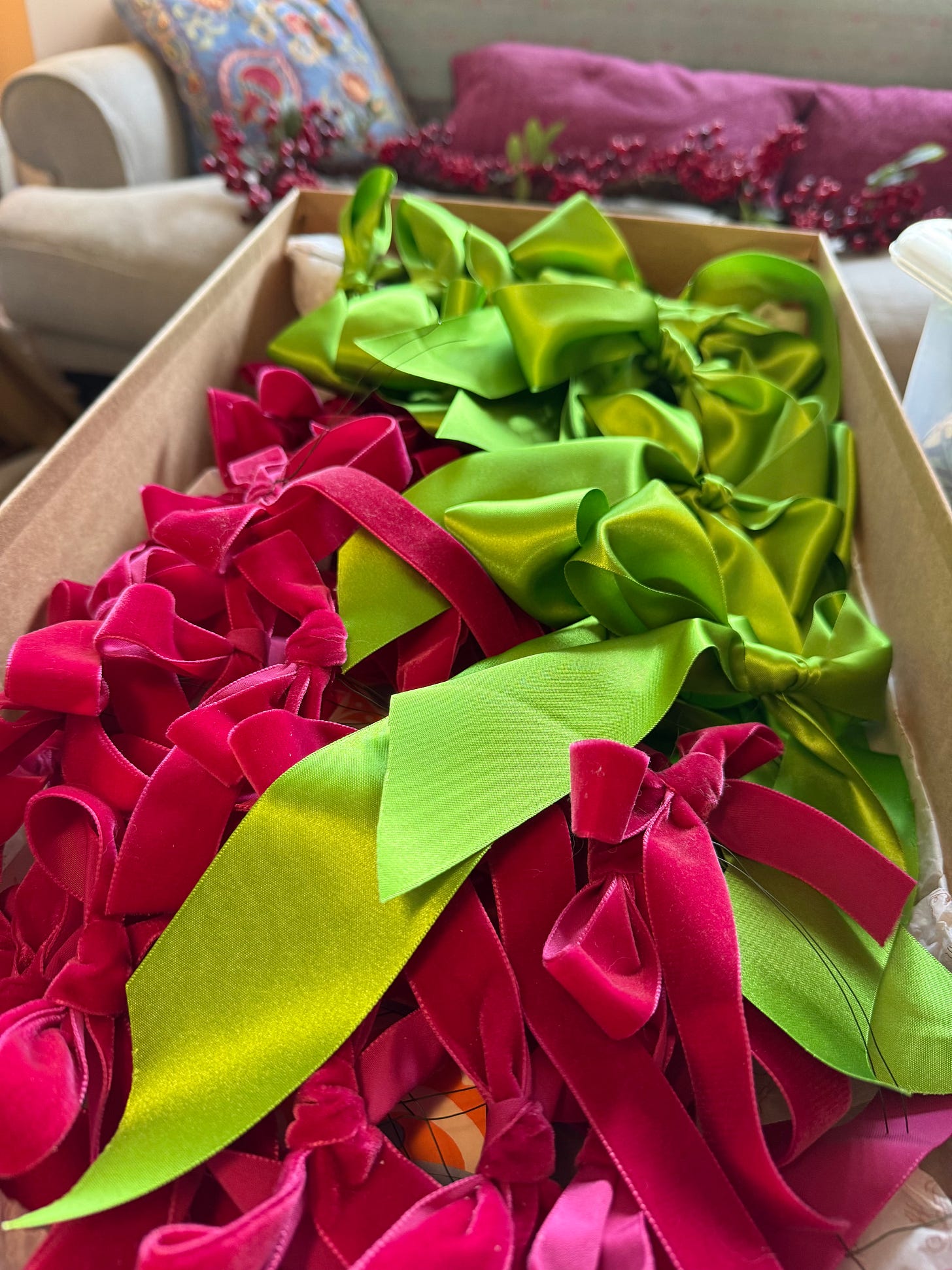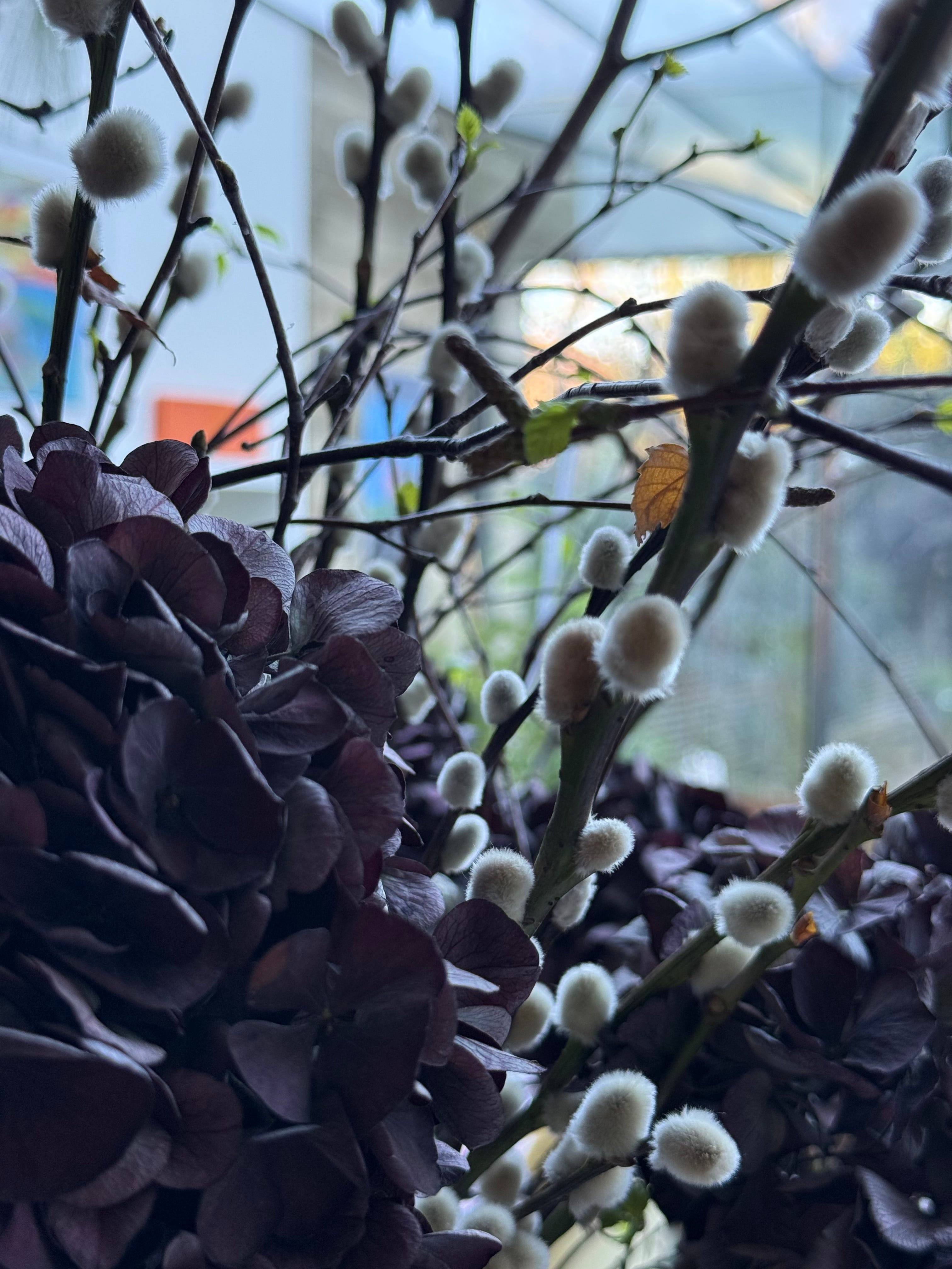 She gave me three giant garlands, stuck with pussy willow and silver birch and cornus twigs, and pinecones and those huge magnolia leaves, sprayed silver, and two huge vases filled with more of the same, together with deep aubergine dried hydrangea blooms, and everything was also adored with white and burgundy feathery things…all done by a florist and absolutely magnificent!