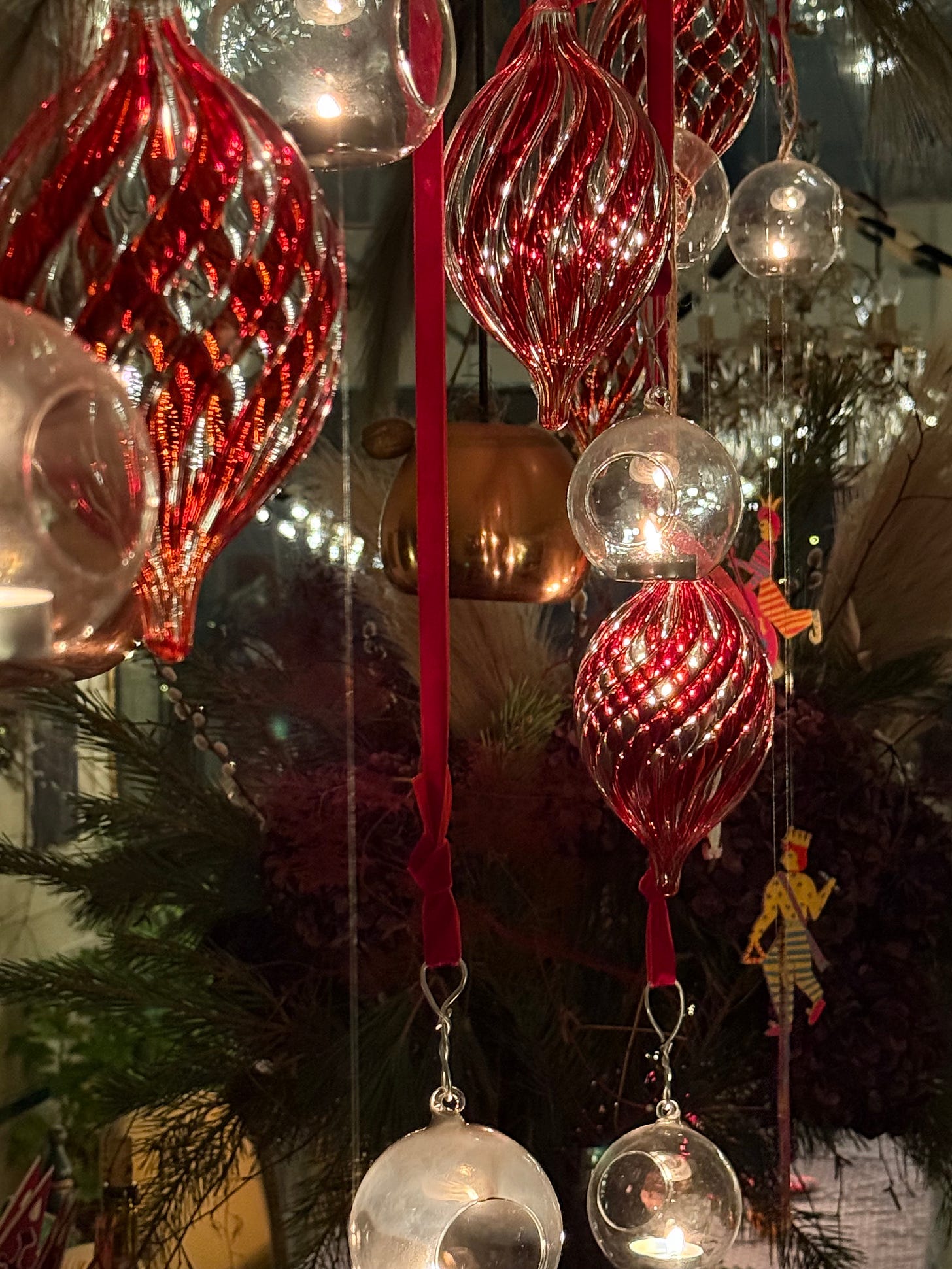 Most wonderful of all was a huge hanging installation made of magnolia branches and pussy willow, and more of these feathery bits, with suspended baubles and candle holders. I’ve added some painted christmas musicians decorations from The Fabled Thread and I just LOVE it so much! I would never have thought of using these colours together, and the feathers? And the silver leaves? Just nope…and yet it all looks so utterly beautiful and twinkly and magical, and it has taught me that I need to be more open-minded…about basically everything. So that is one of my resolutions for this year.