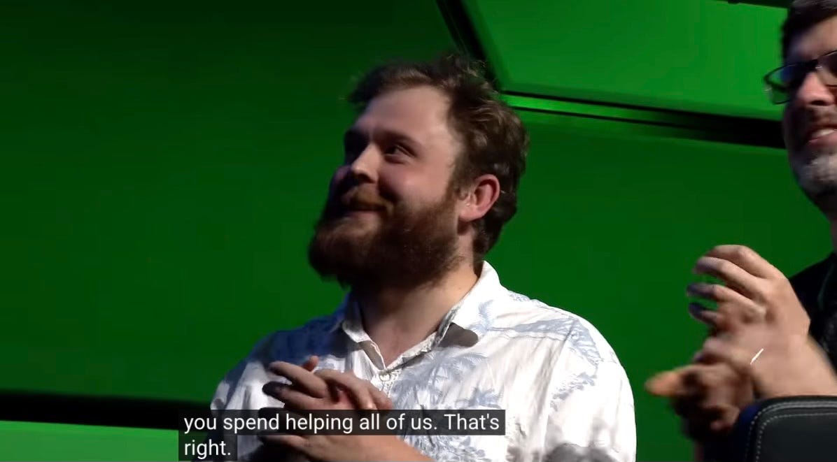 Michael Jarman…World Champion supreme Excel ATHLETE. Look at him! As he says to the audience, he’s ‘over the moon!’ I love this whole thing. Long live the geeks. Adore.