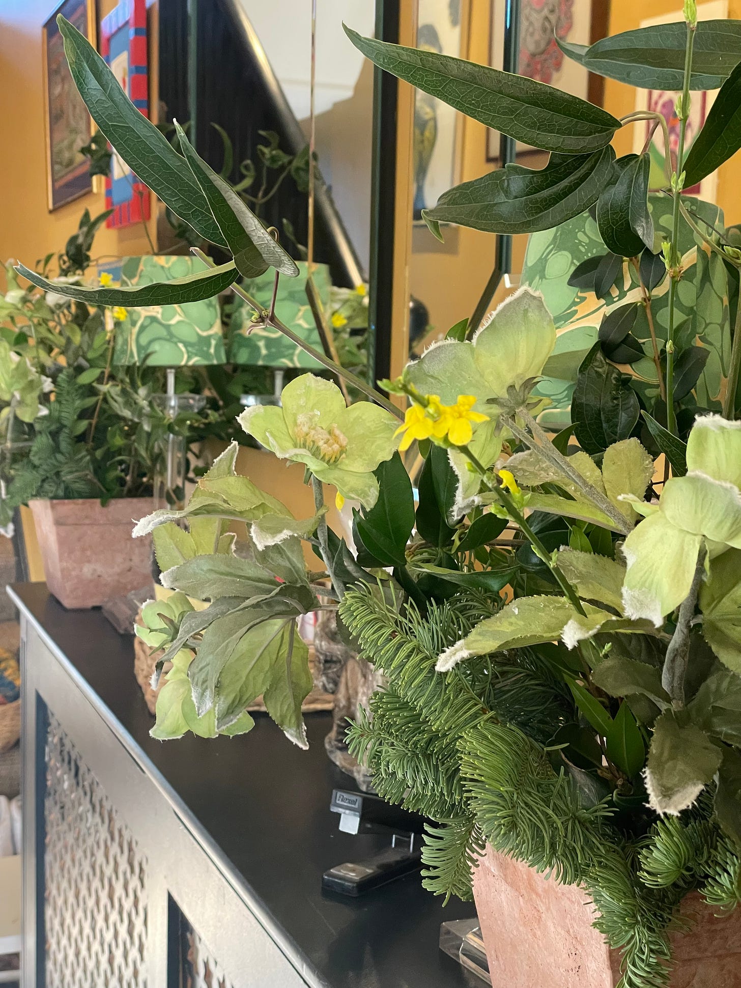 If you’re a florist you’ll probably notice that I am not one. But if you’re a civilian you most probably won’t. The making of these pots of foliage was as artless as it gets. Stems get grabbed, the lower leaves get stripped and the thing gets poked in. That’s it. Here is the greenery I used - most from the garden, some were leftovers from the wreath-making event I did: